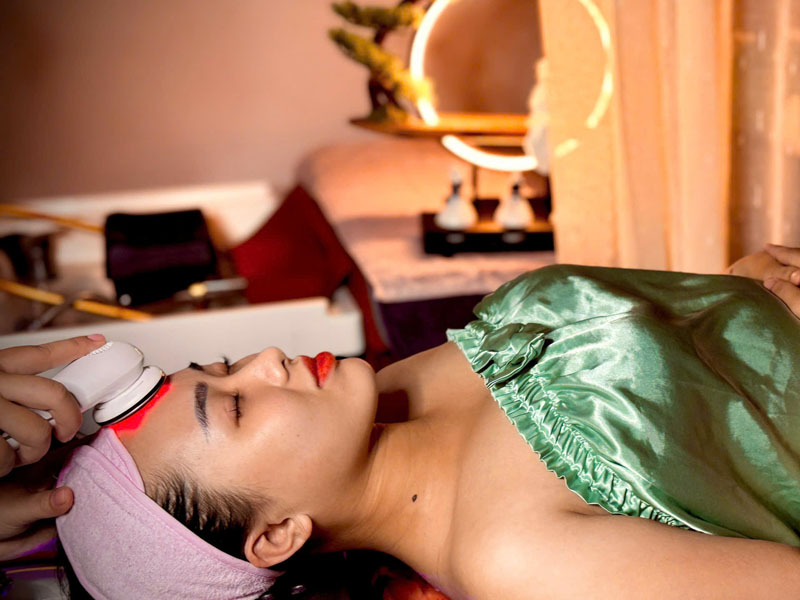 Acupressure with nano technology essential oils / Day ấn huyệt với dầu công nghệ nano- Combination of electric pulse ultrasound and infrared light / Kết hợp máy xung điện - máy siêu âm và đèn hồng ngoại